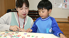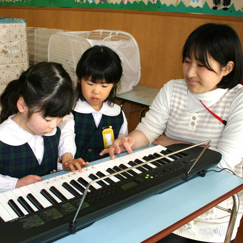 また、当園では木下音感教育法を通して、音楽のよろこびを感じる心、表現する力を育てています。幼児期は、耳からの刺激で脳が著しく発達する時期と言われており、音を聴くことにより五感を刺激し、音楽活動を通して集中力や意欲、忍耐力、協調性を身に付けています。